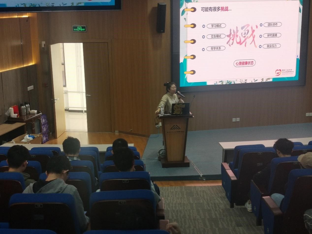 心理健康教育中心的唐婧老师主持。唐老师从情绪低落与抑郁的差异切入话题,并带领大家探讨了在面临研究生生活时,如何调整自身心理状态,以一种积极健康的精神去面对上述挑战。同时针对入学后进行的心理测试结果,逐项为大家解释分析,让大家进一步客观科学地认识了自身的心理状态。并结合案例分析,为大家讲解了心理健康素质与心理健康水平的差异,让同学们进一步了解认识了心理健康在工作生活中的引导性与重要性。最后,就心理健康认识与同学们展开交流互动,引导同学们敞开心扉,直面自身心理状态,勇于分享自身心理困惑,并积极寻求专业帮助。