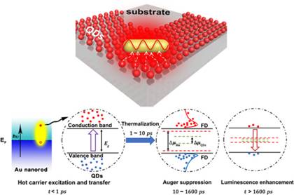 Prof. Hongqiang Wang and associate Prof. Hongyue Wang group (School of Materials Science and Engineering, Northwestern Polytechnical University), in collaboration with Prof. Hongtao Bian (School of Chemistry and Chemical Engineering, Shaanxi Normal University), Prof. Herve Aubin (Department of Nanoelectronics Center for Nanoscience and Nanotechnology, CNRS, University Paris-Saclay), associate Prof. Taihong Liu (School of Chemistry and Chemical Engineering, Shaanxi Normal University), and Prof. Aloyse Degiron (Université de Paris, CNRS, Laboratoire Matériaux et Phénomènes Quantiques,) recently published a paper entitled “Bright CdSe/CdS Quantum Dot Light-Emitting Diodes with Modulated Carrier Dynamics via the Local Kirchhoff Law” on ACS Applied Materials Interfaces (2021) 13: 56476-56484. In this research, they reported the investigation of coupling between Au antennas and the quantum dot (QD) assembly within the framework of the local Kirchhoff law, which shows that the amplitude of light emission depends on the carrier concentration and decay. The Au antennas inject hot electrons into quantum dot assemblies via plasmon-induced hot electron transfer that increases the carrier concentration, and the localized surface plasmon resonances of Au antennas favorably tilt the balance between nonradiative Auger processes and radiative recombination in the CdSe core, as illustrated in Figure 1.