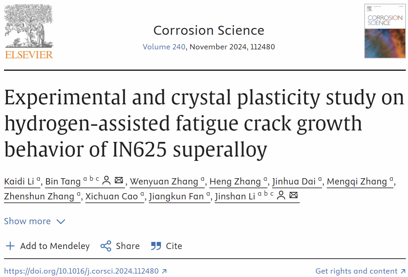 The research, titled Experimental and Crystal Plasticity Study on Hydrogen-Assisted Fatigue Crack Growth Behavior of IN625 Superalloy has been published in the leading corrosion journal Corrosion Science (DOI: 10.1016/j.corsci.2024.112480). The corresponding authors are Professor Jinshan Li and Professor Bin Tang from the State Key Laboratory of Solidification Technology, and the first author is Ph.D candidate Kaidi Li. This work was supported by the National Science and Technology Major Project (J2019-VI-0023-0140).