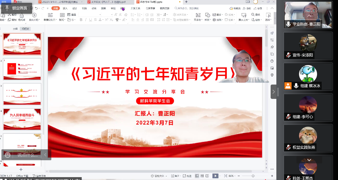 研讨会上,3位汇报人从各自的角度分享了自己的学习看法与理解,他们充分准备,将自己的感悟完美展现,汇报范围从学习习近平总书记的知青岁月,十九届六中全会精神,到共青团十八届六中全会精神,再到习近平总书记的重要讲话精神和两会精神等。同学们认真听讲,积极踊跃发言参与研讨,仔细理解领会其中内涵并分享自己的看法。