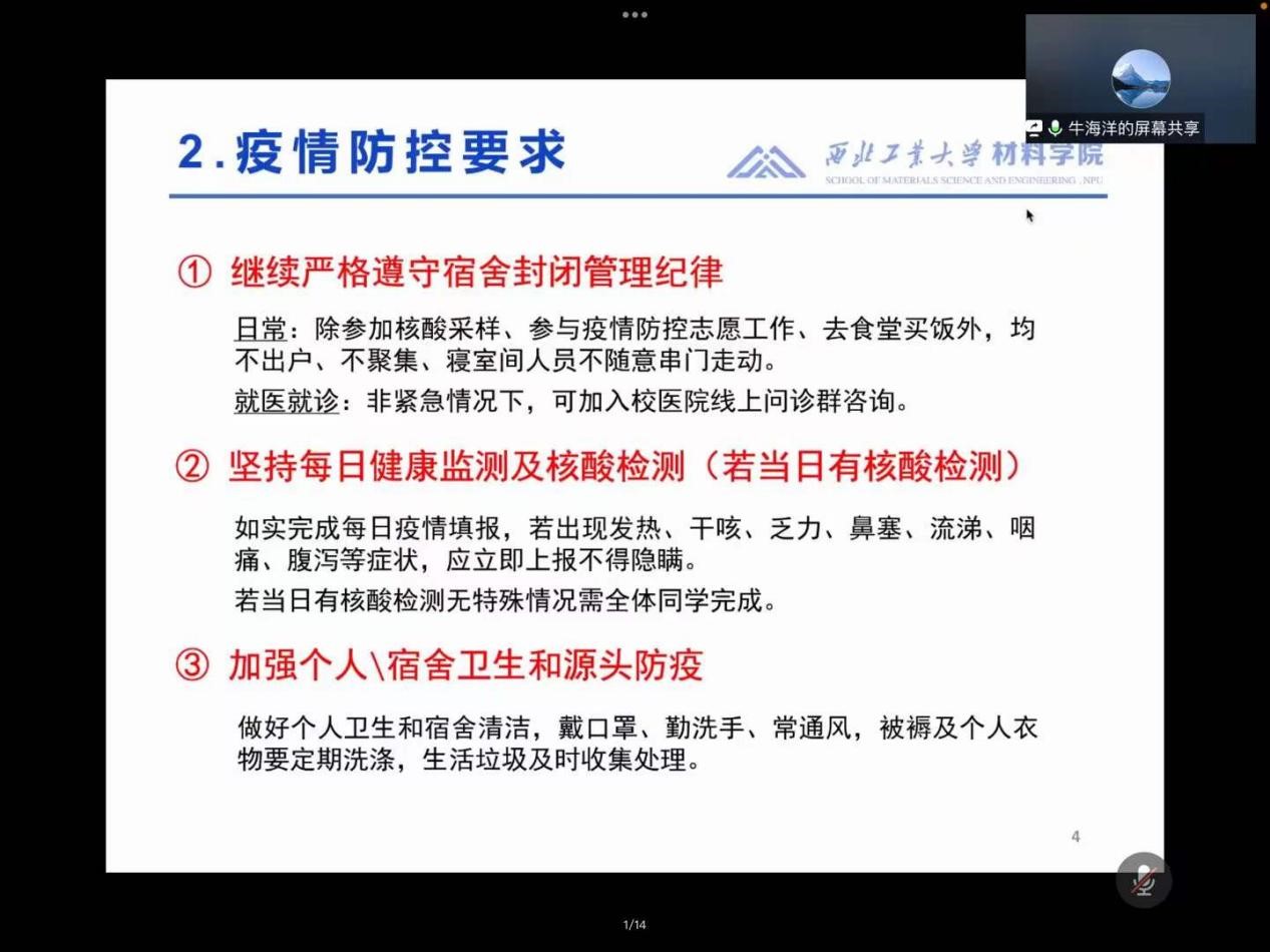 辅导员牛海洋结合当前疫情防控有关要求,对学校在线学习有关要求进行了强调,要求全体同学坚持做好疫情防控基础上,坚定信心、安心学习。兼职辅导员张小霞结合自身学习经验向同学们提出在线学习的建议,鼓励同学们做好提前预习,提高学习动力和自律能力,舍友之间要相互监督、共同进步。