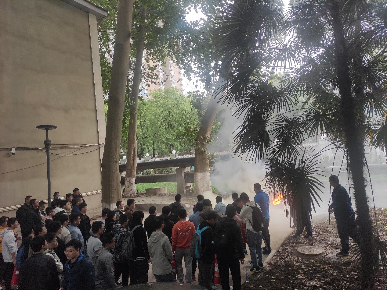 讲座结束后,公安处消防科老师亲自操作向学生展示和讲解了灭火器的使用方法和注意事项,组织全体参会师生在公字楼后面的空地进行了火灾的实地扑救演练,并告诫师生们在面对火灾时要沉着冷静,不恋财,将自己的生命安全放在第一位。在场师生都积极响应,按要求进行认真演练,有效掌握了灭火器的使用方法。