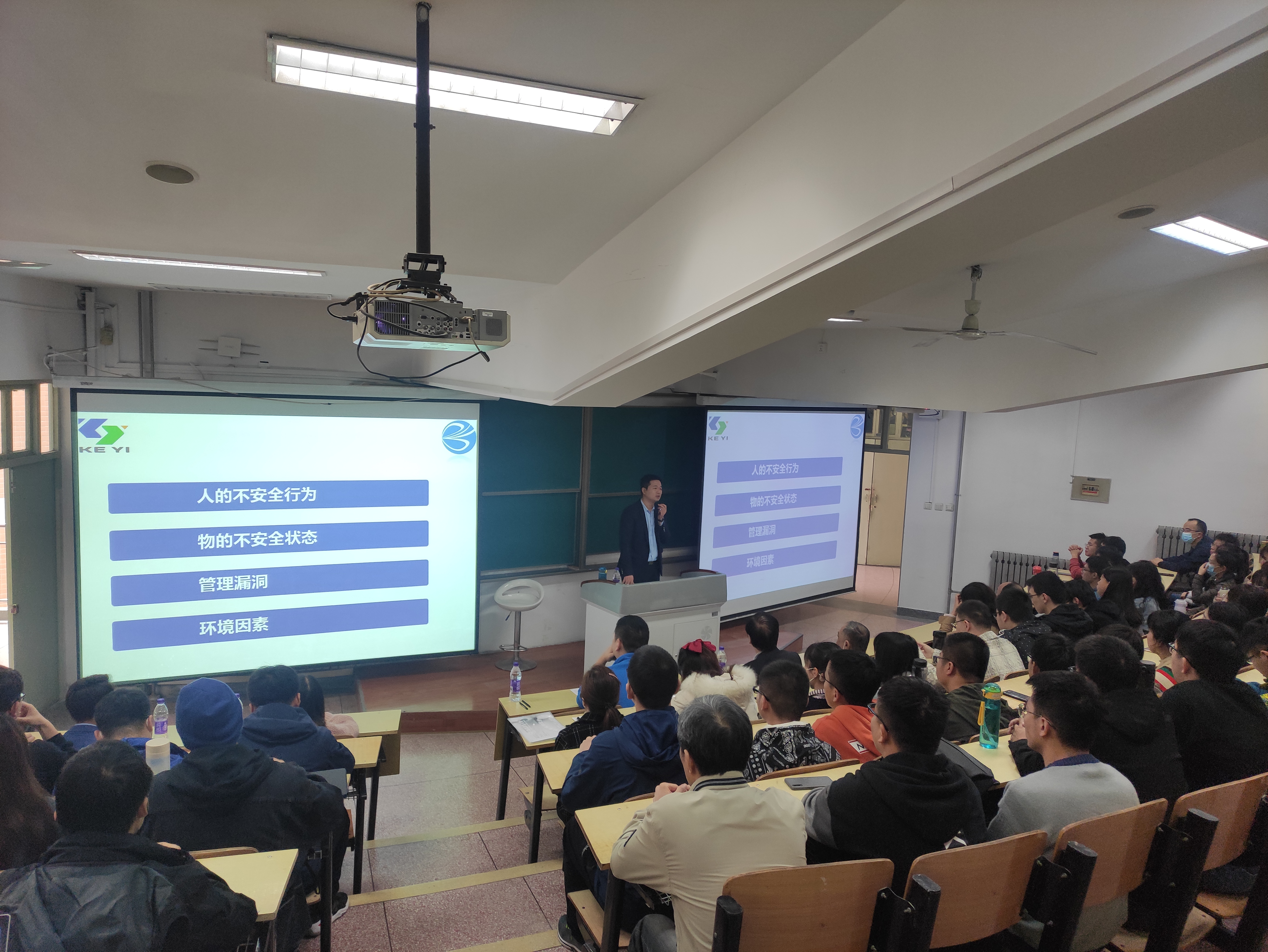 刘涛的报告共分两个部分。首先是实验室常见的安全隐患。刘老师结合近年高校实验室安全事故典型案例,详细分析了安全意识淡薄所导致的严重后果。在此基础上,刘老师主要介绍了实验室安全基础理论,从法律法规、实验室面临的危害、个人防护重要性、消防设备识别及管理、实验室空气质量控制与防护、实验室试剂储存现状等方面详细介绍了实验室通常存在的风险、管理预防措施,以及实验室药品试剂科学管理的基本原则等。刘老师的报告案例丰富、注重互动、条理清晰,引起了全场师生的共鸣,气氛热烈。