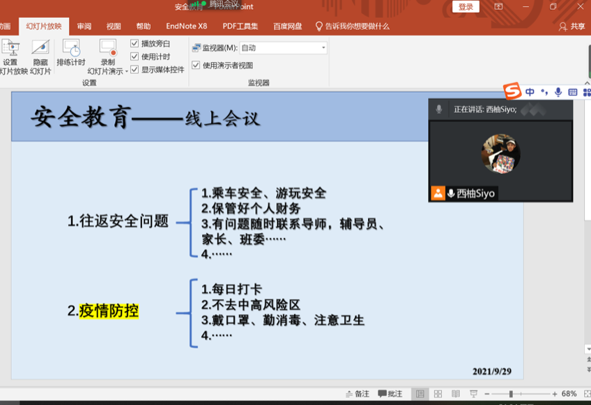 9月29日下午,辅导员张曦老师向各班传达了学校《2021年国庆节放假安排的通知》,强调学生非必要不离开西安,鼓励广大同学留校过节、就地过节。同时,进一步向各班培训了假期请假流程,明确外出须履行请假或报备手续,要求同学们假期不掉链子不松弦,严格落实疫情每日填报工作。