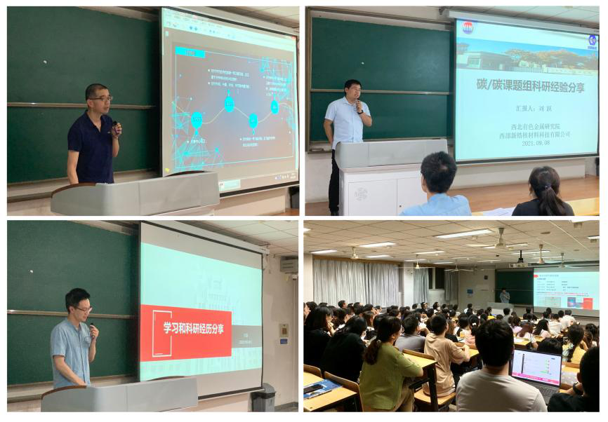 在李贺军院士的指导下,碳材料师生融合党支部教师党员发起了“实验室设备现场培训与安全教育”和“已毕业优秀博士”回访交流活动。碳材料师生融合党支部于9月5日组织了陕西省纤维增强轻质复合材料重点实验室现场培训和安全教育活动,并分别邀请到了毕业于2006年的黄荔海博士(西安伟建微波通讯技术公司)、毕业于2017年刘跃博士(西北有色金属研究院)和毕业于2020年的庄磊博士(西安交通大学)来组交流。来自不同科研工作岗位的三位优秀博士分别从个人研究生经历、科研经验分享和工作期间收获感悟等方面为在校研究生展开宣讲,并勉励新生做科研要戒骄戒躁,要“博观而约取,厚积而薄发”。