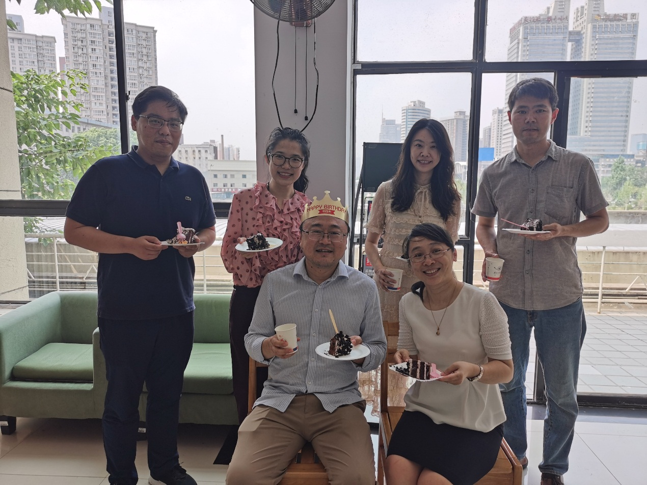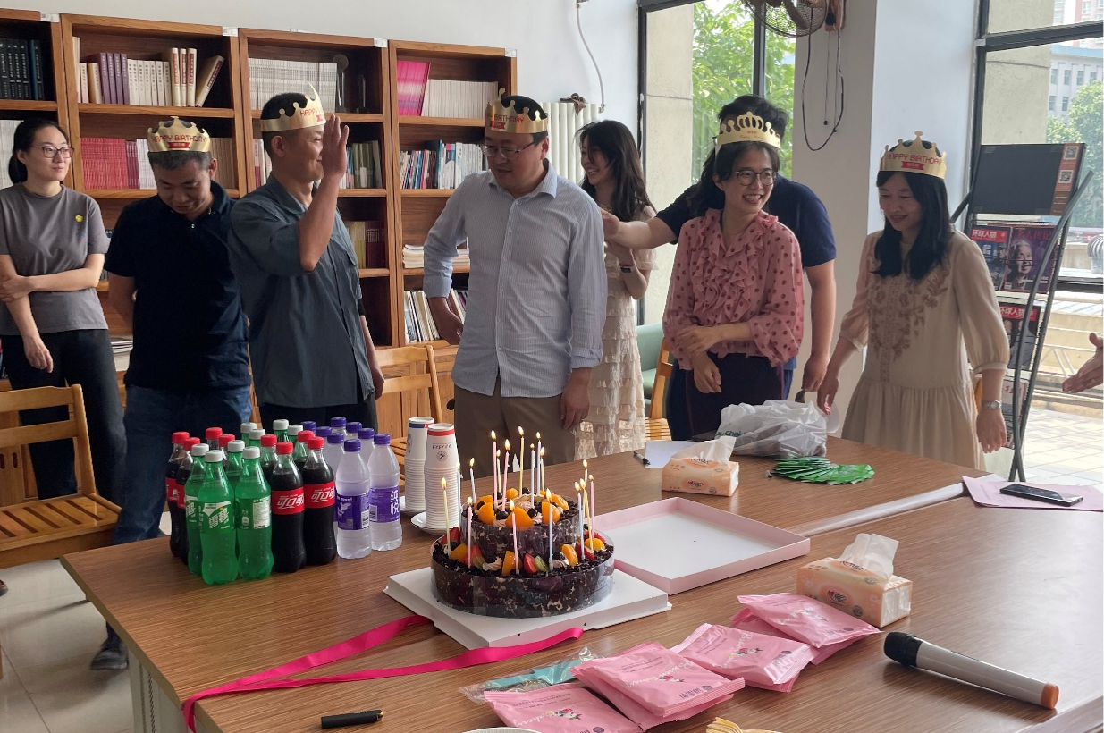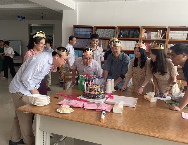 罗皎首先代表学院对各位老师表达了生日的祝福,并与大家一起合唱《生日快乐》。付前刚在致辞时指出,希望通过本次活动的举办,让大家在紧张的教学科研工作之余放松心情、增进交流,让学院这个大集体更加温暖,欢迎大家多提意见建议,一起把这项工作做得更好。在柔和温馨的音乐中,大家一起吹灭蜡烛,在轻松快乐的氛围中分享美味蛋糕和祝福,分享工作生活点滴,分享各自快乐人生。