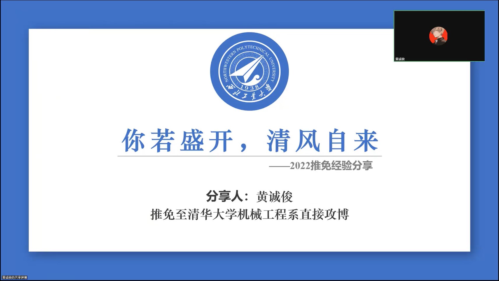 为推进学院学业学风建设和帮助2020级本科生更好地了解学校研究生推免相关政策和要求。在学院蔡利剑副书记和2019级辅导员的大力支持下,10月23日晚7点,2020级本科年级邀请到边张驰、吴昊泽、黄诚俊、秦文洋和张路通等五位2019级同学线上分享了学习、竞赛和科研等经验,2020级120多名本科生和2020级辅导员线上参会。