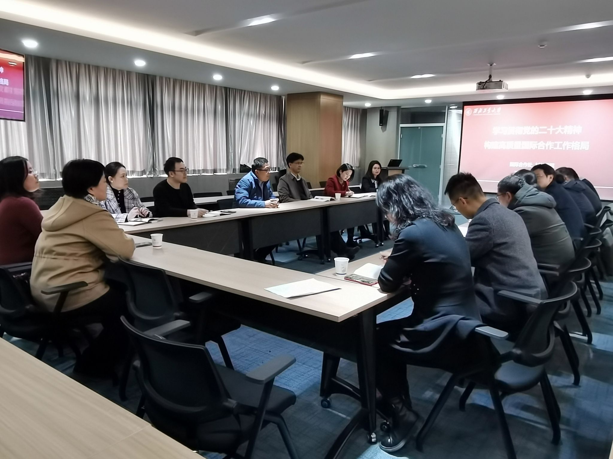 会议就学习党的二十大精神,深入开展高质量国际合作开展研讨。学院分析了学院在构建高质量国际合作网络中国际合作平台建设、顶尖国际合作伙伴拓展、留学生招生途径及招生质量等方面面临的问题。