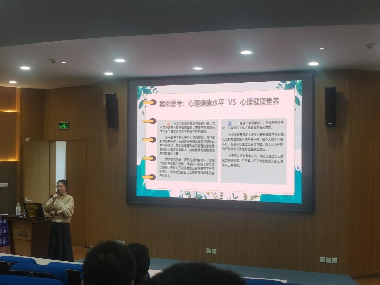 心理健康教育中心的唐婧老师主持。唐老师从情绪低落与抑郁的差异切入话题,并带领大家探讨了在面临研究生生活时,如何调整自身心理状态,以一种积极健康的精神去面对上述挑战。同时针对入学后进行的心理测试结果,逐项为大家解释分析,让大家进一步客观科学地认识了自身的心理状态。并结合案例分析,为大家讲解了心理健康素质与心理健康水平的差异,让同学们进一步了解认识了心理健康在工作生活中的引导性与重要性。最后,就心理健康认识与同学们展开交流互动,引导同学们敞开心扉,直面自身心理状态,勇于分享自身心理困惑,并积极寻求专业帮助。