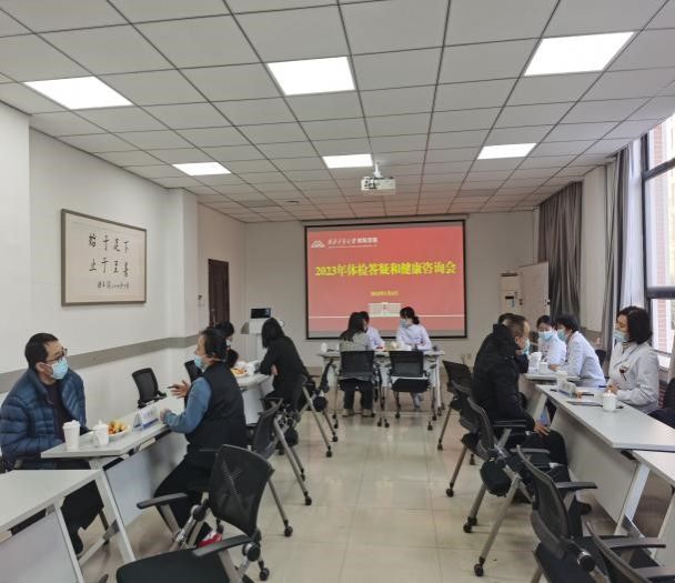 2023年教职工体检报告解读和健康咨询会在公字楼328会议室举行,校医院体检中心主任陈金华等9名医护人员来院坐诊。咨询会由学院分工会主席张勇主持,学院党委副书记蔡利剑出席会议并发表讲话。