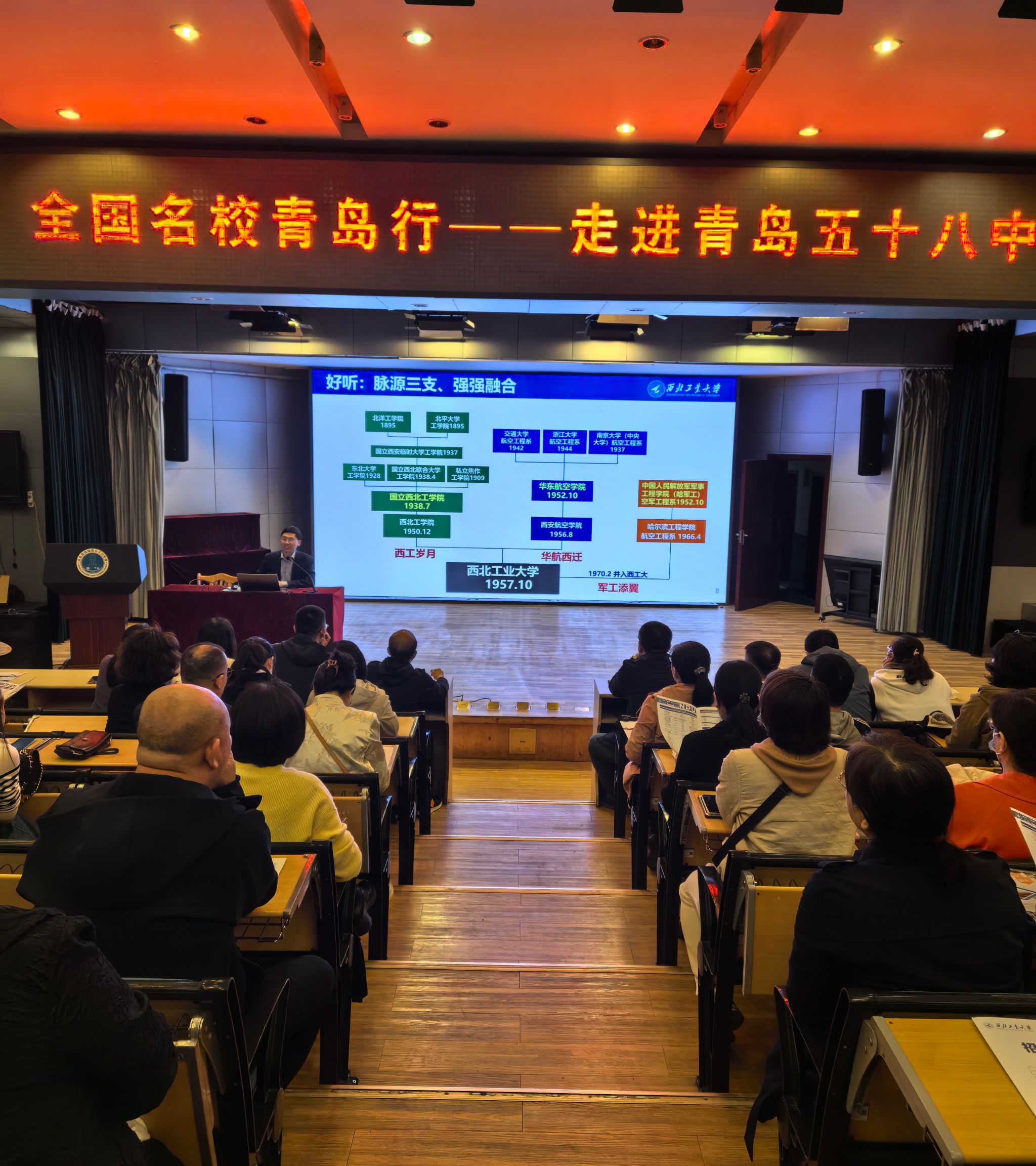 在山东青岛五十八中,付前刚向高三学生家长介绍了学校和学院基本情况、办学特色和优势专业,学校招办相关业务负责人李佩就西工大招考目录、招生政策和强基计划做了解读,高清无码