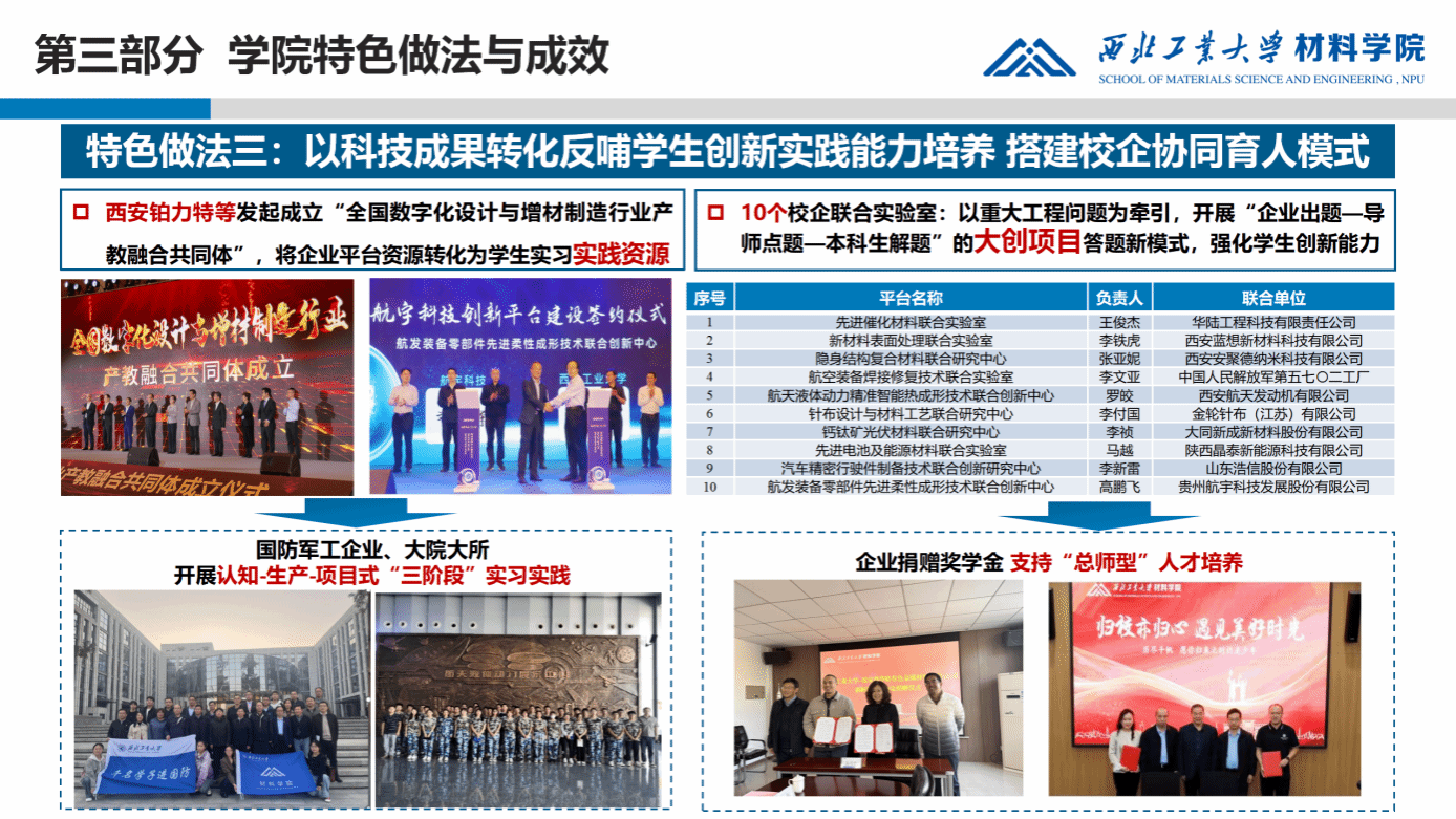 坚持把党旗插在人才培养第一线,发挥好师生融合党支部与大院大所共建、CJ校企联聘、行业讲座教授等作用,促进党建工作与教育教学工作双促进、双提高。学院与中国航空制造技术研究院、中国航空工业集团公司北京航空材料研究院、中国航天科技六院十一所等30家院所、企业等开展校企支部共建,开展认知-生产-项目式“三阶段”实习,使学生身临其境感受科研成果助力大国重器研制和社会经济发展,培养学生投身军工事业的家国情怀。将实践育人、服务育人与组织育人有机结合,融入人才培养全过程,依托延安、照金等丰富红色资源,开展“走初心之路,点亮红色中国”实践教学,打造爱国主义实践“金课”;开展同心抗疫、爱心支教、乡村振兴等特色活动,打造志愿服务和社会责任实践“金课”,提升群团工作成效。坚持党建带团建,引领广大青年高举团旗跟党走,青春建功新时代。近3年,学院人才培养质量持续提升,本科生深造率达到77%,学生良好学风态势逐步形成,稀有金属材料与加工团队获校“三全育人”先进集体,获校级科研育人示范团队2个。学院团委入选首批陕西省高校团建标杆院系,“摆渡者青年志愿者服务队”入选“榜样100”全国最佳大学生社团。