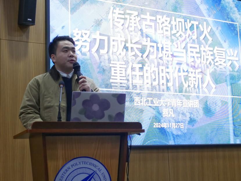 费凡以《传承古路坝灯火,努力成长为堪当民族复兴重任的时代新人》为题,用国立西北工学院学生在抗日战争时期的英勇故事,展现了强国复兴路上工大学子汇聚的星星之火,用学校获批的各大重要项目展现“天下工大、世界三航”的远景目标,希望工大学子牢记习近平总书记对新时代青年提出的“五个模范”,为全面推进中华民族伟大复兴作出新的更大贡献。