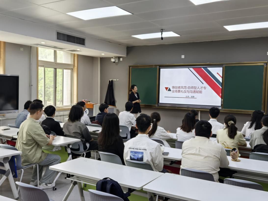 邀请十四运会颁奖礼仪专业培训教师姚静副教授,为铸剑6班同学们讲授“铸剑者风范•总师型人才专业场景礼仪与沟通赋能”培训课,班级辅导员冯婷婷主持活动。