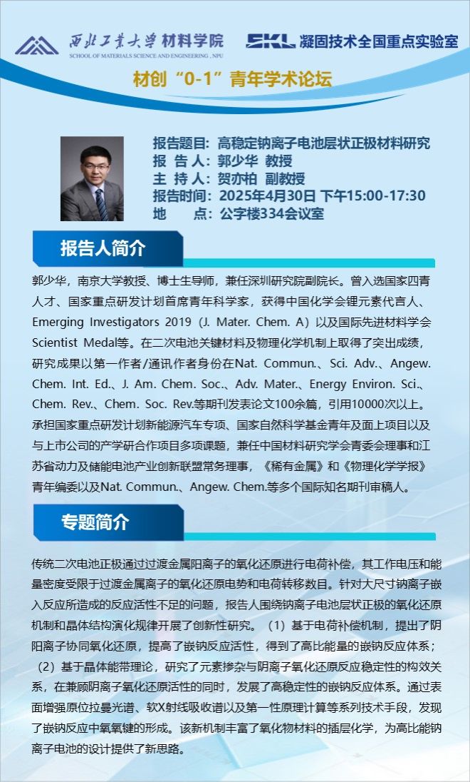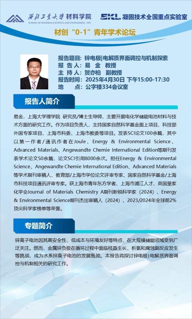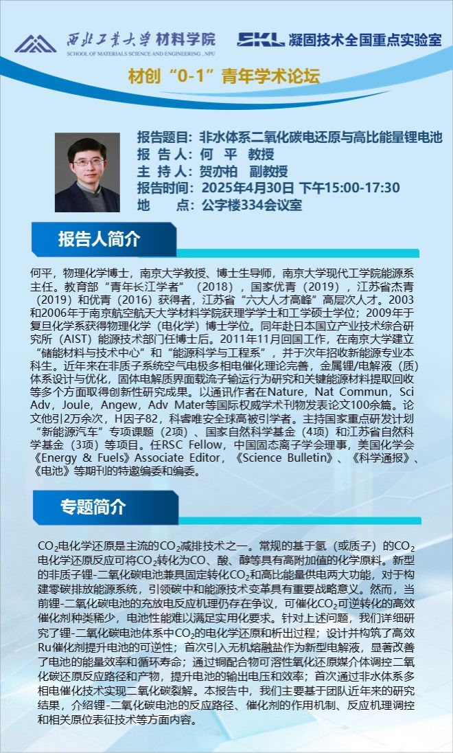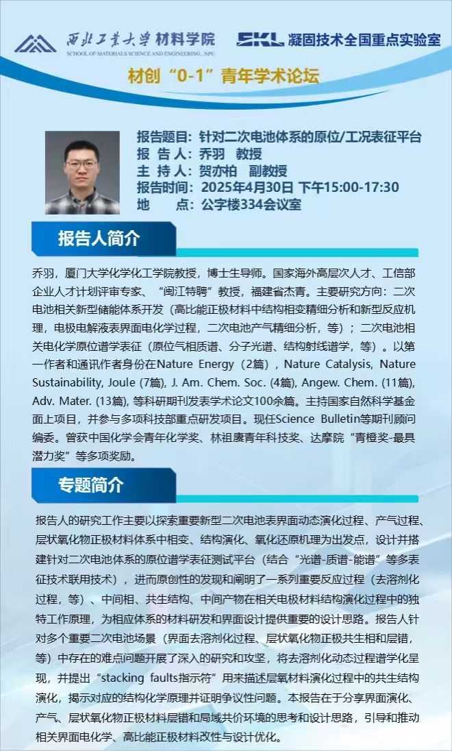 材创“0-1”青年学术论坛:锌电极|电解质界面调控与机制探索、针对二次电池体系的原位/工况表征平台、高稳定钠离子电池层状正极材料研究、非水体系二氧化碳电还原与高比能量锂电池