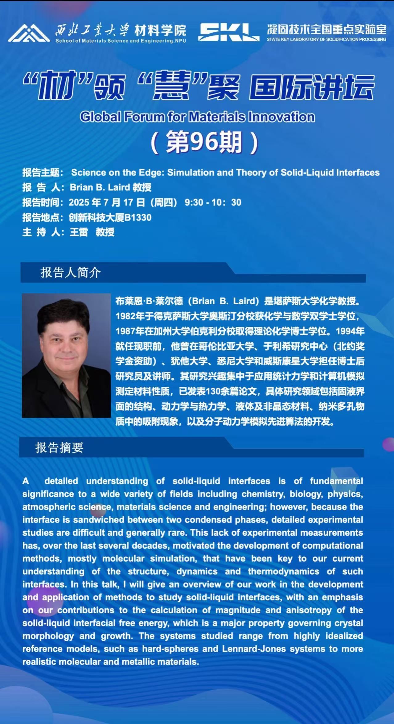 报告主题:Science on the Edge: Simulation and Theory of Solid-Liquid Interfaces