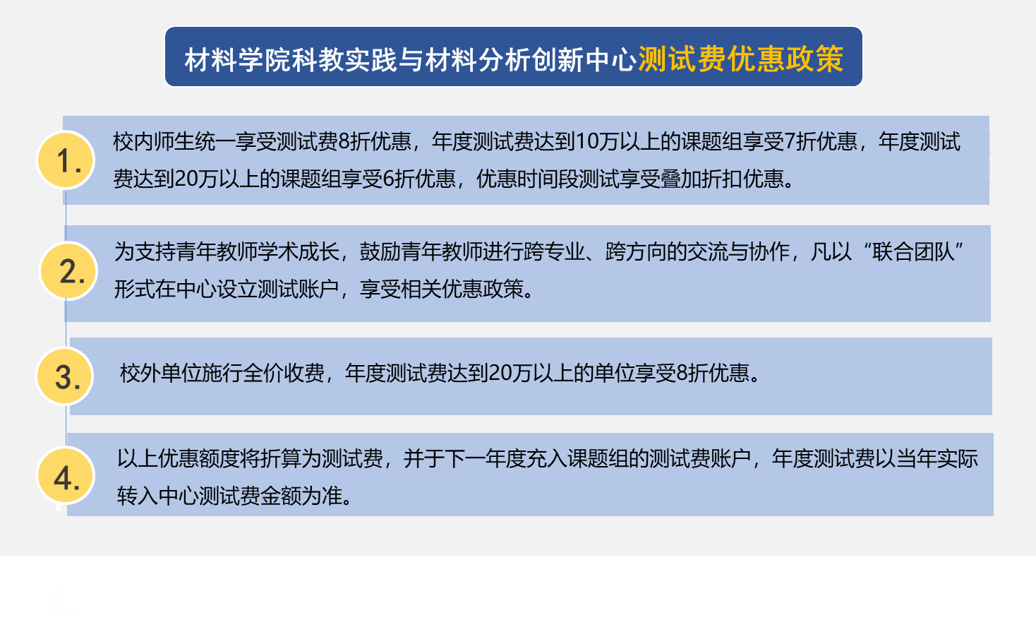 科教实践与材料分析创新中心(陕西省材料分析研究中心)2024年度继续实施测试费优惠政策。自2019年至今,中心已连续六年实施测试费优惠政策,累计发放奖励金额1325.88万元。