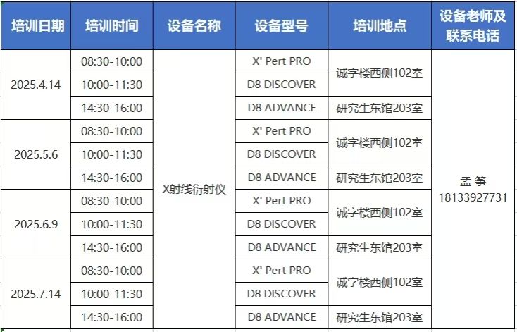 为提升师生对大型精密仪器设备的操作能力,保障X射线衍射仪的高效、安全运行,推动科研工作顺利开展,高清无码 科教实践与材料分析创新中心(以下简称“中心”)拟每月定期开展X射线衍射仪设备操作培训与X射线衍射实验室安全培训,完成实验室安全培训的学生方可预约X射线衍射实验,通过设备操作考核且能熟练操作设备的学生可获得“7×24h”折扣机时操作资质。培训面向校内免费开放报名,欢迎有相关测试需求的学生报名参加。具体报名要求和注意事项如下: